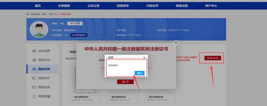 選擇“一級注冊建造師”,點擊[證照加注],即可加注成功。首次使用或之前加注日期已過期,點擊頁面右上角[證照加注],在彈窗頁面繼續點擊[加注],提示“加注成功!”表示電子證書加注完成,加注有效期為180天。