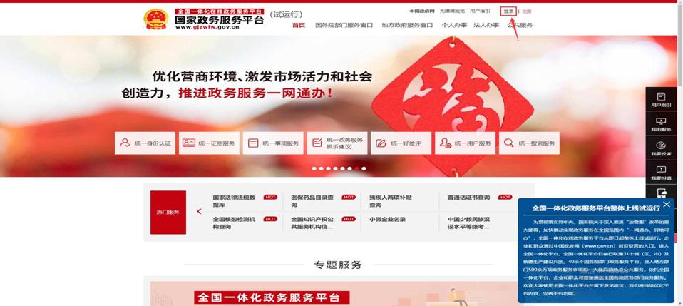 點擊門戶右上角[登錄],填寫國家政務服務平臺用戶名、密碼后登錄門戶。