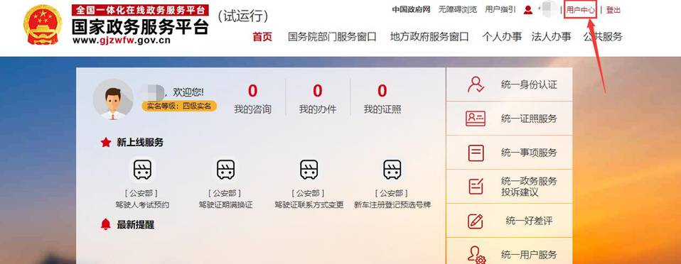 2.實名身份認證登錄成功后,點擊[用戶中心],進入用戶中心頁面。
